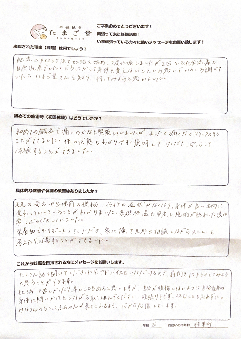 たまご堂さんに通うなかで、自分ではあまり気付かなかったアレルギーっぽさ(蚊に刺された部分が水ぶくれになる等)があるかもしれないことを教えてもらいました。小麦や、ヨーグルトを意識的に減らして、腸内環境を整えました。月経周期も短め、低温期・高温期もいまいちはっきりしませんでしたが、睡眠の質が上がり細かいことは気にならなくなりストレスが減った気がしました。6回目も化学流産でしたが、並行で不妊クリニックに通いはじめ、一般検査を行い、たまご堂さんで体質改善を行い7回目の妊娠で継続することができました。通うたびに、ワンポイントアドバイスをもらうことができて、小さな不安にも的確に答えて頂き本当に安心できました。