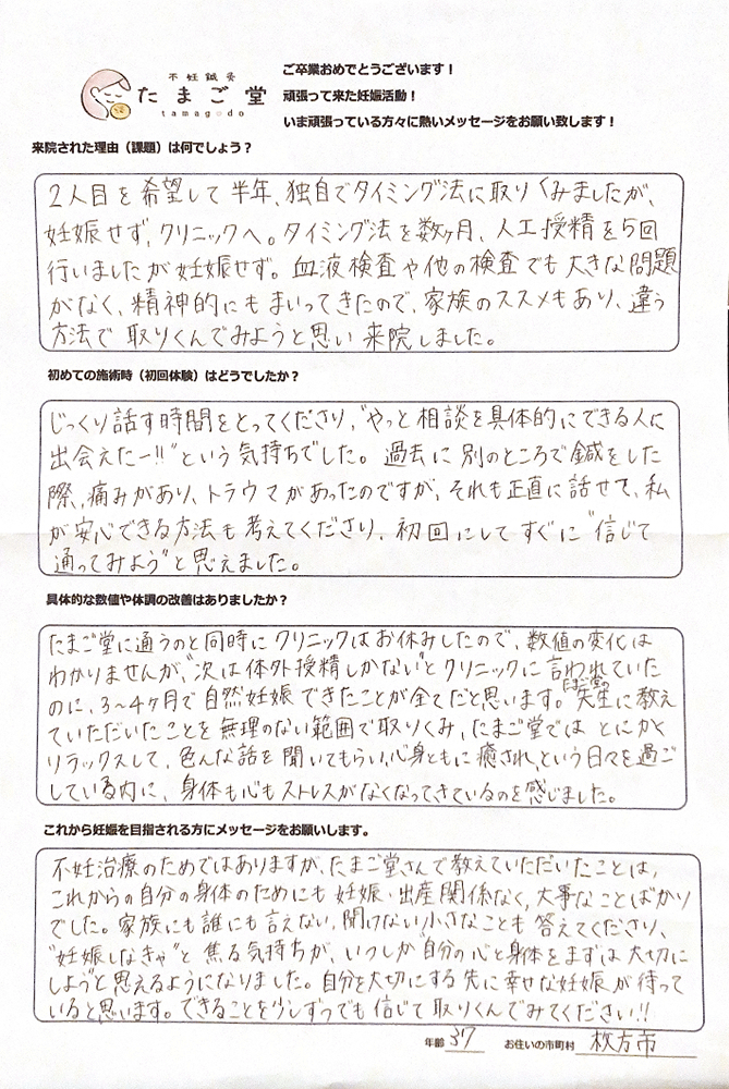 私はいつも先生に治療のことだけでなく、日々の悩みや体調のことも話してアドバイスをもらい、本当に頼りにさせていただきました。自分を信じて、たまご堂を信じて頑張って下さいね。