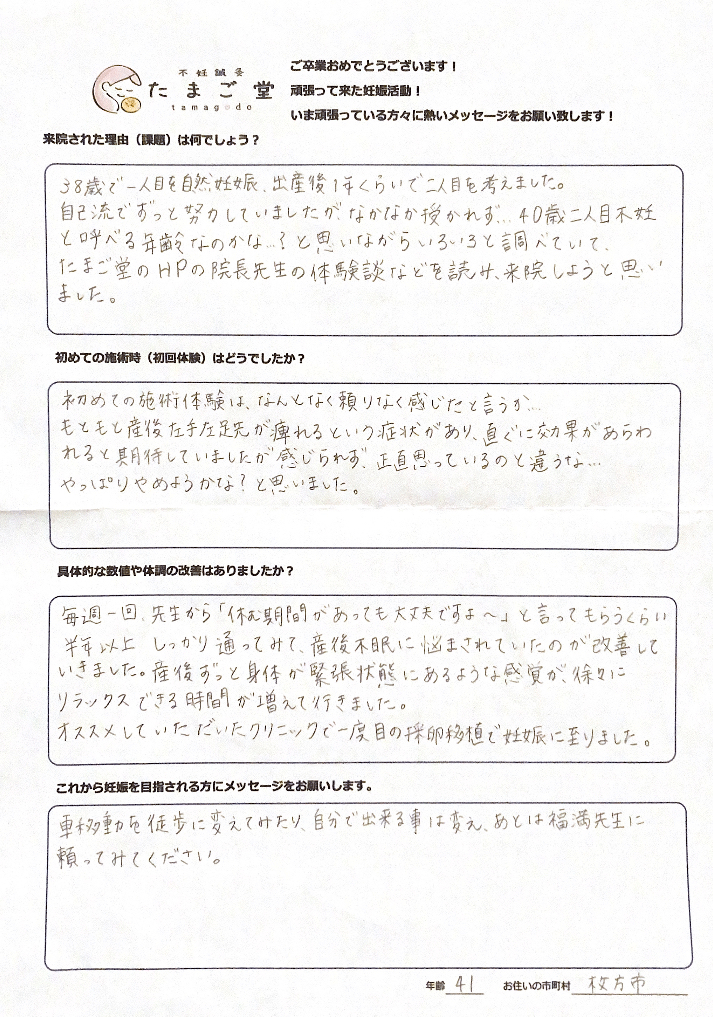 結婚前から甲状腺バセドウ病の持病があり、29歳で結婚しその後、頚椎症性神経根症を発症。治療する日々が続き、あっという間に37歳になり妊活できない日々を過ごしました。37歳の年に年齢的にも焦りがありそろそろ子供のことを考えなければと思い不妊治療を始めましたがなかなかうまくいかず。その後もメニエール病、パニック障害も発症し不妊治療も困難になりました。そんな時たまご堂さんのことを知り、まず体調を整えることを目的と不妊治療がスムーズにいくようこちらを来院してみようと思いました。(ちょうどその頃主人が単身赴任で不妊治療がうまくいって欲しいとより強く思っていたと思います)